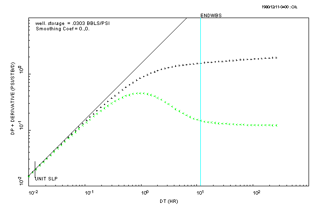 There should be a unit-slope line drawn through the data points with a unit slope, and a vertical line indicating where the end of well-bore storage effects occurs. In theory, the data after the end of well-bore storage effects is the data that you can analyse for reservoir properties.