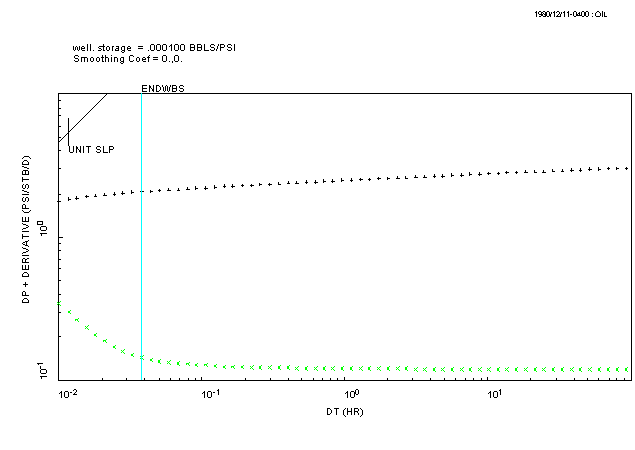 The end of well-bore storage effects is calculated from the C(min) value and a vertical line is drawn to show this time on the plot. The end result of these steps should look something like this: